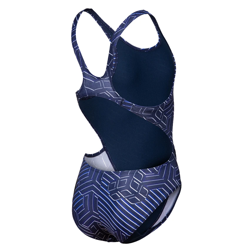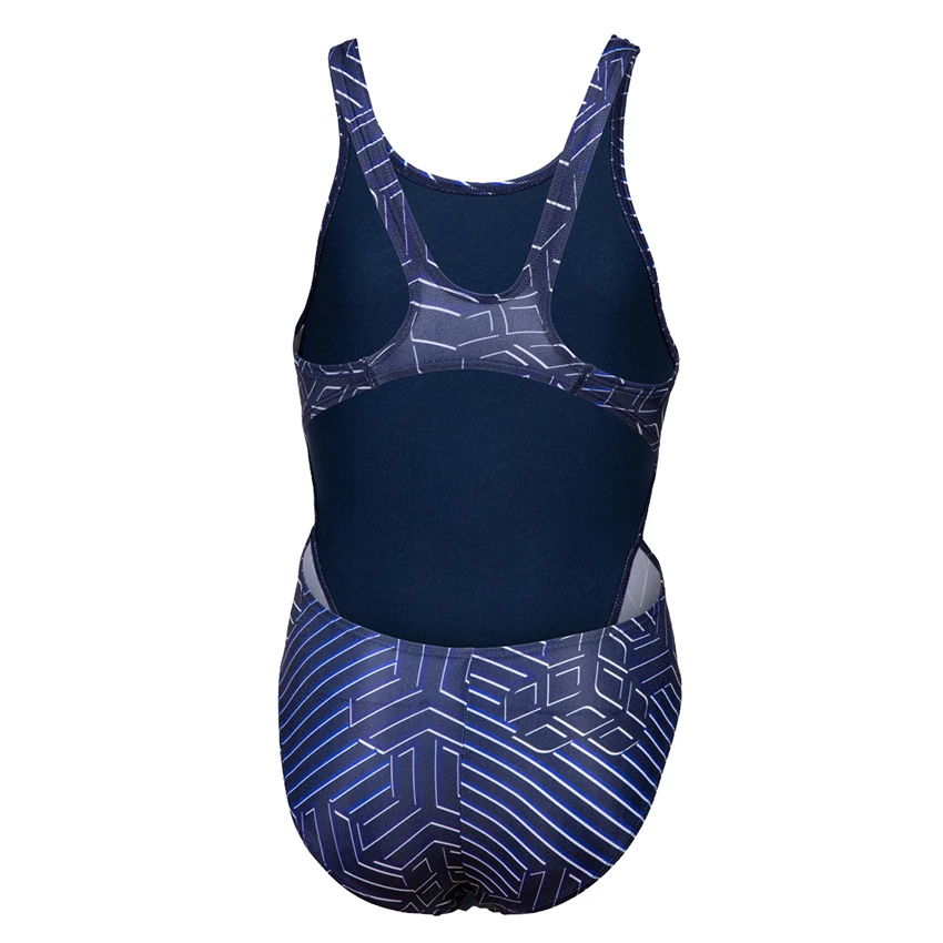 The blue Arena Kikko girls swimsuit is smart and stylish with an all over pattern. Japanese culture influences the Kikko range. The super smart pattern is based on a traditional motif that symbolizes armour and also strength. Sophisticated and eye catching it is available in a several models. The tech style back has a wide opening which allows maximum freedom of shoulder movement and reduced drag for improved glide.