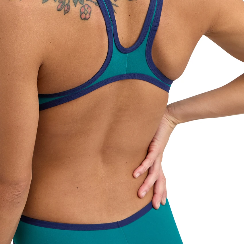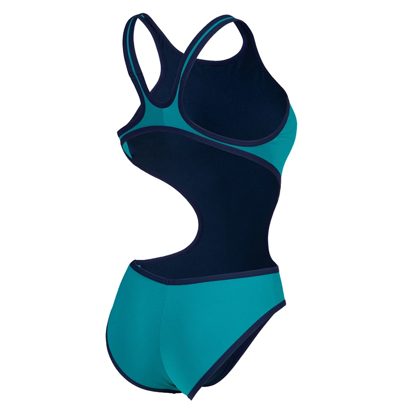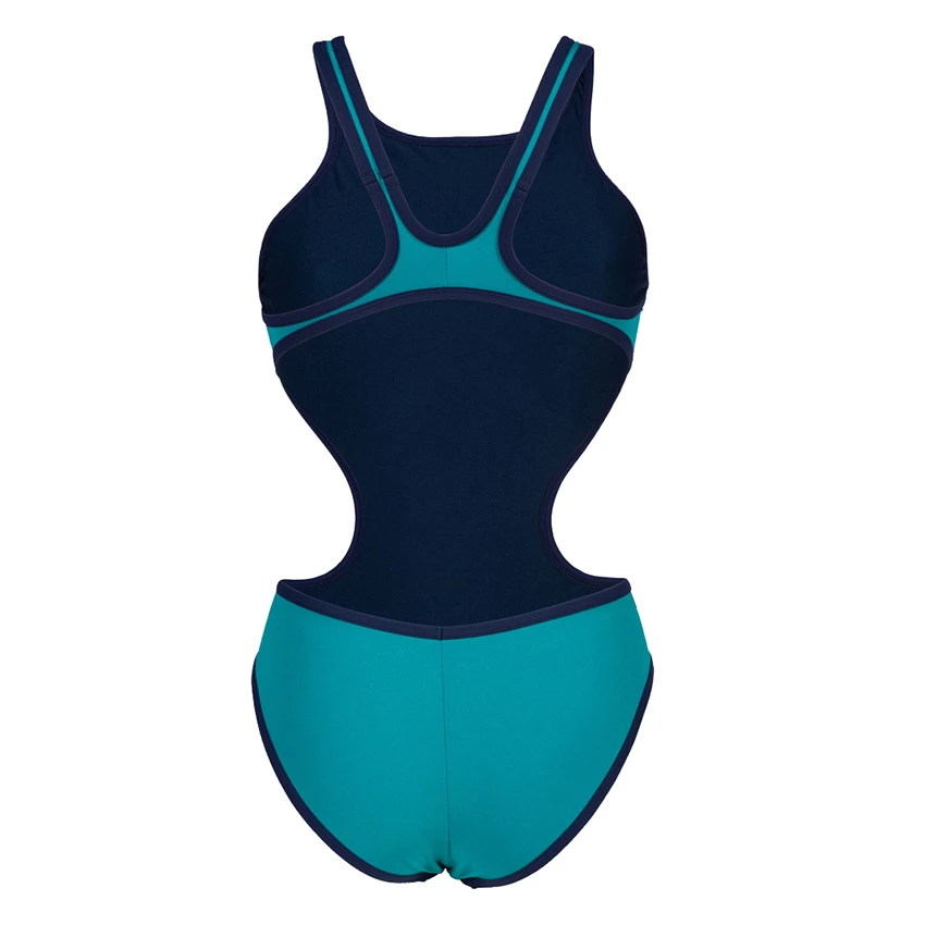 The Womens Arena One Biglogo Swimsuit – Green has as its name suggests a big logo on the front! Also it is made from just one piece of fabric. The ONE has deep cut outs on the waist so from the back the swimsuit almost looks like a bikini. The trim is blue and this extends through to the straps at the back. The stylish offset line logo is a matching blue.